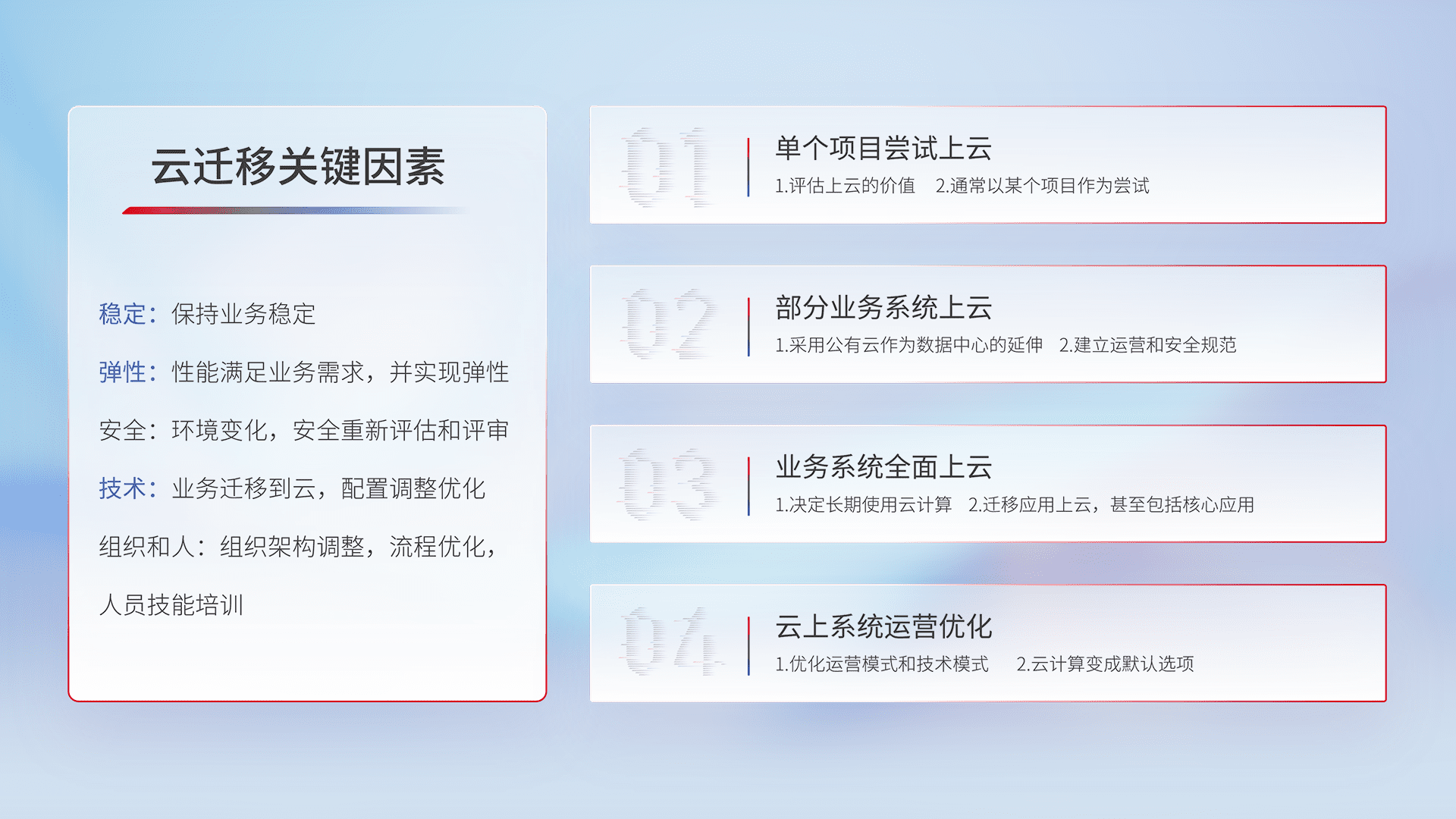 结合实际业务,,从规划设计、、云平台选型、、、云原生改造、、、、数据迁移、、集成交付,,迁移全过程为客户识别最佳上云路径,,,做好风险识别管理,,,设计网络架构、、、身份权限、、、安全审计合规、、、操作审计、、、日志审计、、、监控告警策略、、多站点容灾设计等,,对云上基础设施进行整体规划,,,,提升IT治理水平,,,,以满足弹性、、、、高可用、、、高性能的需求。。