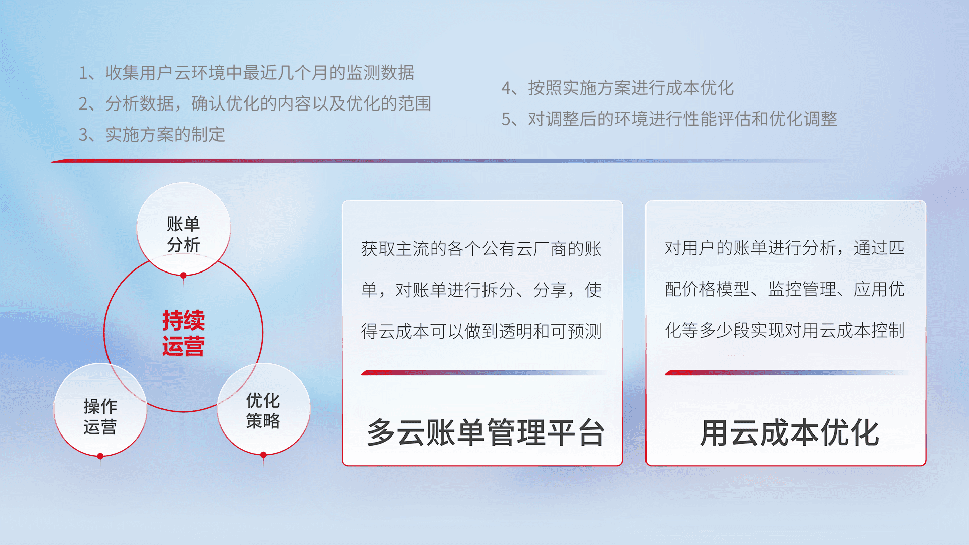 通过多云纳管,,,,以统一的资源数据模型把客户的云资源进行抽象和封装,,,,进而实现对多云资源的统一操作,,,,保障云资源管理的可靠性、、稳定性与可用性。。量身定制化运维内容,,,配置、、、开发运维、、、、补丁管理、、、、备份、、、监控、、、认证和访问管理、、、、审计和日常巡检等,,保障在用云过程中的可靠度,,,稳定度以及高可用率。。。。